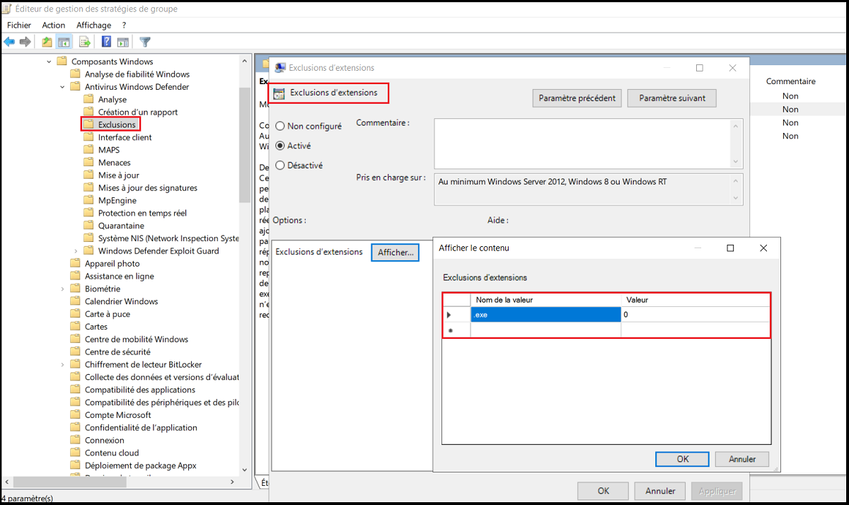 Il faut donc dans la partie Composants Windows -> Antivirus Windows Defender -> Exclusions -> Exclusion d’extensions, créer une règle d’exclusion sur le .exe.