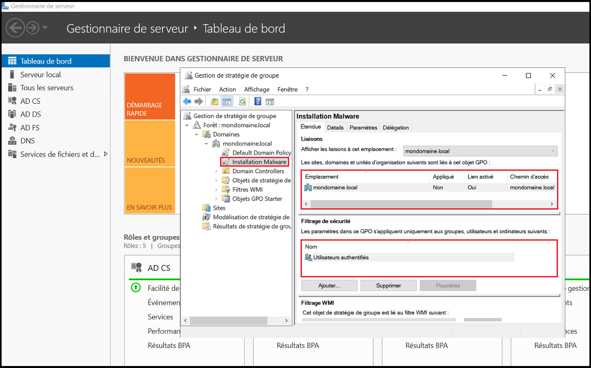 La première étape est de créer la GPO malveillante que je nommerai…Installation Malware qui est effective sur le domaine mondomaine.local et s’applique à tous les utilisateurs authentifiés :