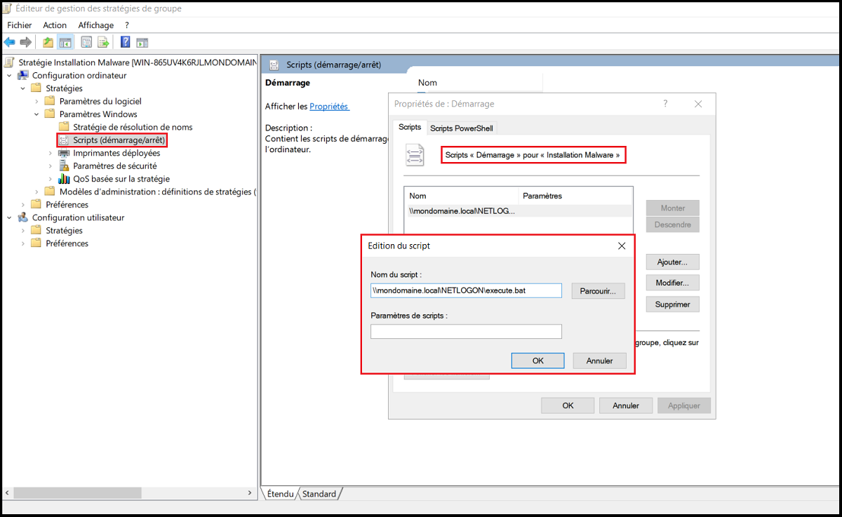 La GPO qui exécutera le script au démarrage de l’ordinateur doit maintenant être créée. Pour ce faire, la catégorie Paramètre Windows -> Scripts (démarrage/arrêt) va être utilisée. Il faut alors spécifier le script en question qui sera démarré :