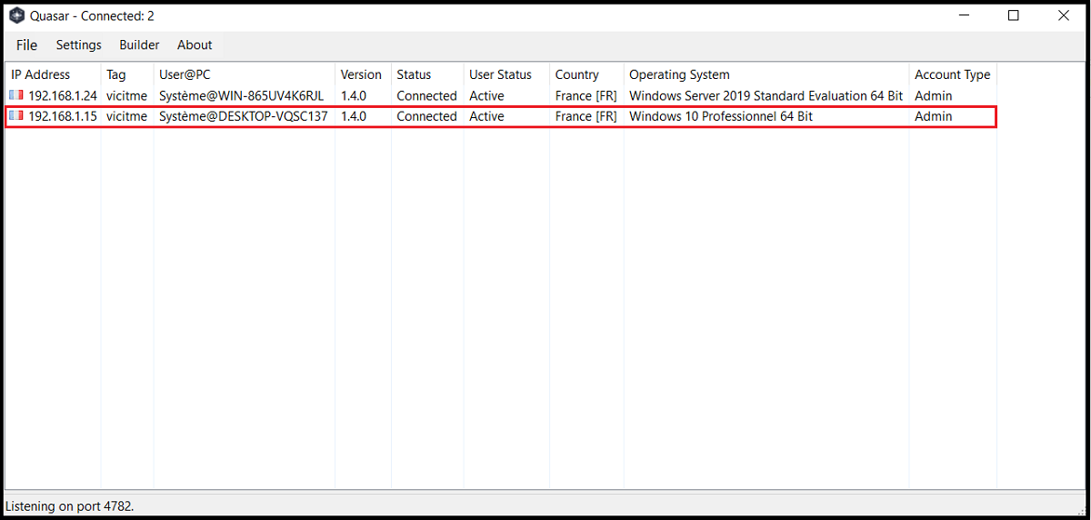 Une fois le redémarrage de l’ordinateur, le script est alors exécuté qui lui même téléchargera le logiciel malveillant et l’exécutera. Du côté de l’attaquant, la victime est alors visible :